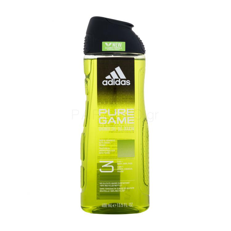 Οι άνδρες προτιμούν να πλένουν όλο το σώμα τους με ένα προϊόν, γι' αυτό και το Adidas Pure Game Shower Gel 3 σε 1 είναι σχεδιασμένο για το σώμα, τα μαλλιά και το πρόσωπο. Χρησιμεύει για την καθημερινή υγιεινή και μετά από αθλητικές δραστηριότητες.