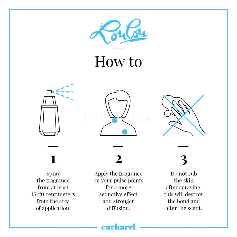 Το άρωμα ανοίγει με μια σύνθεση από ντελικάτα floral αρώματα, ζουμερά αρώματα φρούτων και πικάντικες συμφωνίες που δημιουργούν μια έντονη εναρκτήρια νότα. Αυτά στη συνέχεια αντικαθίστανται από ένα άρωμα που μυρίζει σαν μια αγκαλιά από τα πιο όμορφα λουλούδια. Τα λουλούδια που κρύβονται στην καρδιά του eau de parfum κοσμούνται με ζεστό σανταλόξυλο, άρωμα λιβανιού, βενζοΐνη, σαγηνευτικό μόσχο και το μαγευτικά γλυκό άρωμα της βανίλιας. Το Cacharel Lou Lou Eau de Parfum θα γίνει το γοητευτικό σας αξεσουάρ, ειδικά για τις πιο δροσερές μέρες. Μη φοβηθείτε να ντύσετε το σώμα σας με ένα άρωμα που θα κερδίσει την προσοχή των γύρω σας.