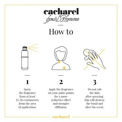 Το Cacharel Pour Homme Eau de Toilette είναι κατάλληλο τόσο για καθημερινή όσο και για βραδινή χρήση. Είναι κατάλληλο για έναν άνδρα που είναι ευμετάβλητος, του αρέσει η ελευθερία, αλλά ταυτόχρονα είναι ένας ήρως με αυτοπεποίθηση που μπορεί να ανταπεξέλθει σε κάθε κατάσταση. Αφυπνίστε την αρμονία σας με το Cacharel Pour Homme. Θα σας συνοδεύσει στο ταξίδι σας, σαν ένας αληθινός σύντροφος που είναι πάντα στο πλευρό σας.