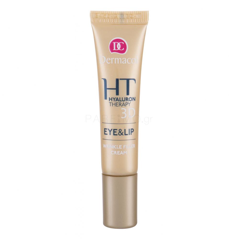 To Dermacol Hyaluron Therapy 3D Eye & Lip Cream με καθαρό σφαιρικό υαλουρονικό οξύ και ισχυρό αντιρυτιδικό σύμπλεγμα. Αποκαθιστά την τρισδιάστατη υφή και πυκνότητα του δέρματος, γεμίζοντας τις ρυτίδες και αποτελώντας εναλλακτική λύση στις ενέσεις υαλουρονικού. Το άμεσα ορατό αποτέλεσμα: την πρώτη ημέρα βελτιώνει τη σφριγηλότητα του δέρματος κατά 35%, την εμφάνιση των γραμμών έκφρασης κατά 12%, μειώνει την επιφάνεια ρυτίδων κατά 36% και το βάθος τους κατά 20%. Μακράς διαρκείας αναζωογόνηση του δέρματος, ορατή λείανση των ρυτίδων, αύξηση της παραγωγής κολλαγόνου και ελαστίνης. Παρέχει ενυδάτωση και φρεσκάδα όλη την ημέρα και καταπραΰνει την επιδερμίδα. Κατάλληλο για όλους τους τύπους δέρματος.