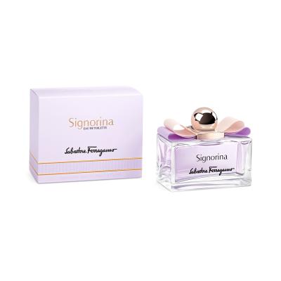 Ένα φρέσκο άρωμα από γκρέιπφρουτ και λίτσι, το οποίο εμβαθύνεται από τριαντάφυλλο, ρύζι, cashmeran και αφρόγαλα - αυτό είναι το eau de toilette Ferragamo Signorina (2012). Θα προσελκύσει τη γυναίκα που είναι λάτρεις των πιο γλυκών αλλά διακριτικών αρωμάτων. Το μπουκάλι του Signorina είναι επίσης εξαιρετικά επιτυχημένο - ορθογώνιο, σε απαλές αποχρώσεις, με στυλιζαρισμένο φιόγκο, αλλά και πρακτικό για κάθε τσάντα. Ψάχνετε για ένα άρωμα που ενισχύει διακριτικά τη θηλυκή σας γοητεία; Στοιχηματίστε στο Signorina Eau de Toilette!