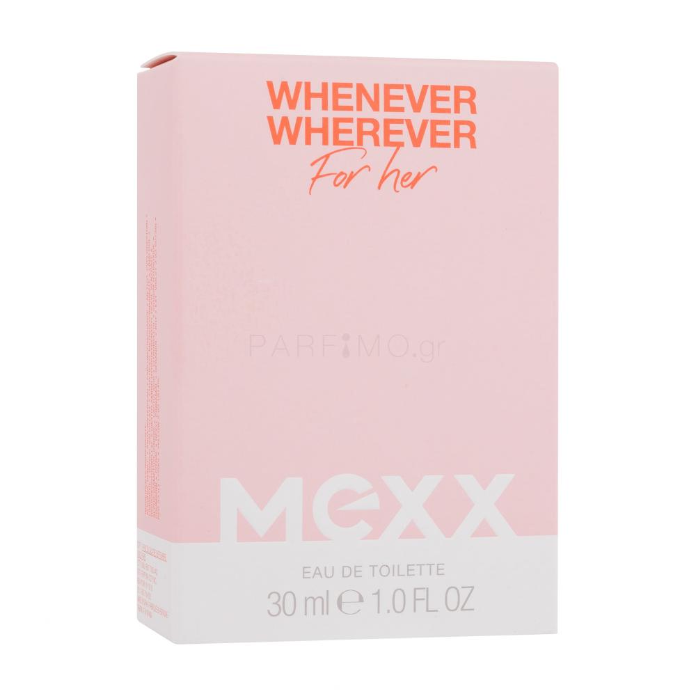 Το Mexx Whenever Wherever Wherever Eau de Toilette είναι ένα ευχάριστα γλυκό, φρουτώδες άρωμα για τη γυναίκα της 3ης χιλιετίας που μπορεί να ισορροπήσει την εργασία με τον ελεύθερο χρόνο και της αρέσει να οργανώνει διασκέδαση για όλη την οικογένεια ή μια ομάδα φίλων. Η σύνθεση οδηγείται από το άρωμα του αχλαδιού, του μόσχου και των λευκών λουλουδιών γιασεμιού, που υπογραμμίζεται από ζουμερές συγχορδίες μανταρινιού. Το Whenever Wherever μπορεί να χρησιμοποιηθεί για κάθε περίσταση, από το πρωί έως το βράδυ, στη δουλειά, σε επαγγελματικές συναντήσεις, μετά από μια επίσκεψη στο γυμναστήριο, για ψώνια, σε μια βόλτα με φίλους και σε ρομαντικά ραντεβού.