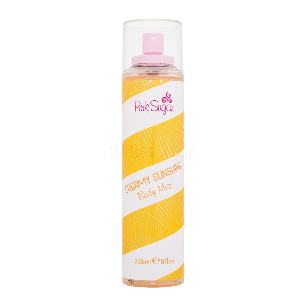 Το δημοφιλές eau de toilette και το σπρέι μαλλιών συμπληρώνονται τώρα από το σπρέι σώματος Pink Sugar Creamy Sunshine. Αυτός το είδος αρώματος έχει ζήτηση επειδή μπορεί να εφαρμοστεί πολλές φορές την ημέρα στο δέρμα σε όλο το σώμα και στα μαλλιά χωρίς το άρωμα του να ενοχλεί τους γύρω σας. Απολαύστε τα σαγηνευτικά αποτελέσματα των ηλιόλουστων εσπεριδοειδών, των εξωτικών λουλουδιών, του σανταλόξυλου και την καραμέλας από το πρωί μέχρι το βράδυ.