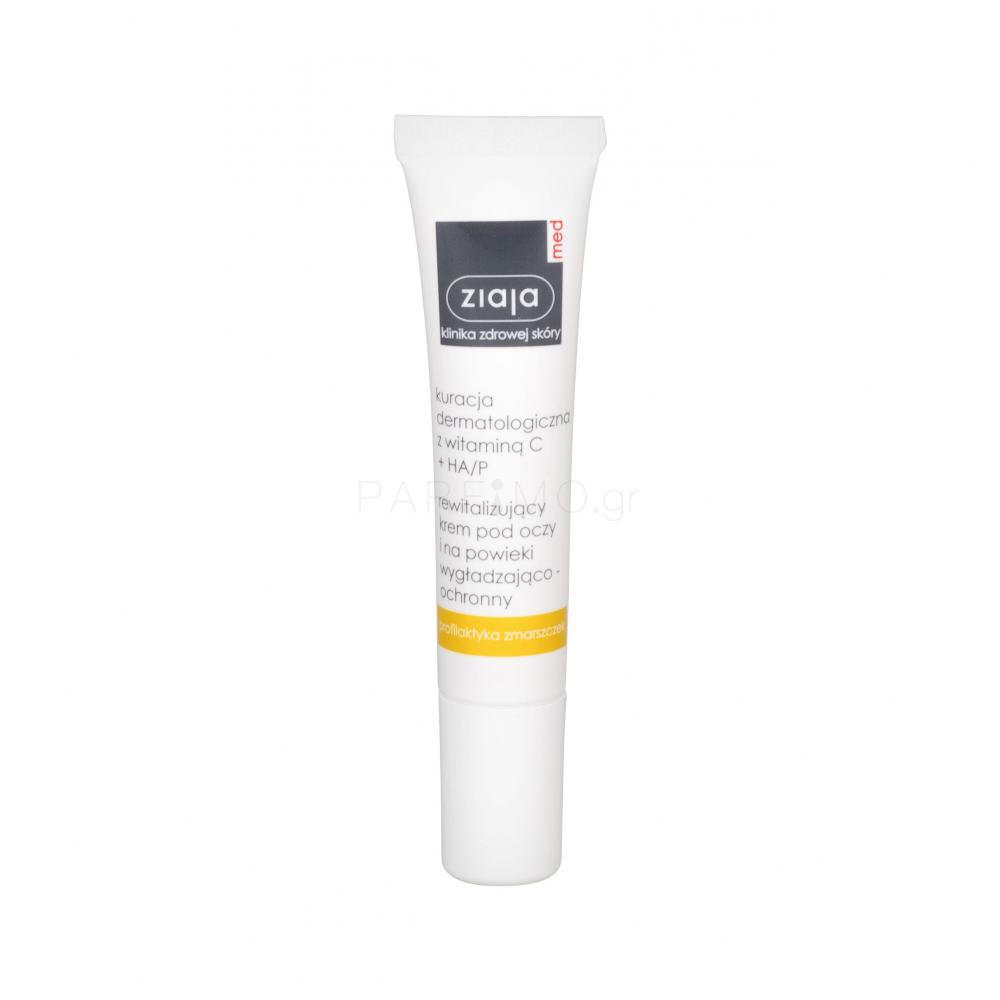 Η αναζωογονητική κρέμα ματιών Ziaja Med Dermatological Treatment Revitalizing Eye Cream είναι εμπλουτισμένη με βιταμίνη C, η οποία απελευθερώνεται σταδιακά στο δέρμα και μαζί με το υαλουρονικό οξύ (HA) και την υδροξυπρολίνη (P) του παρέχει μακροχρόνια φροντίδα.